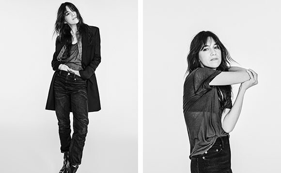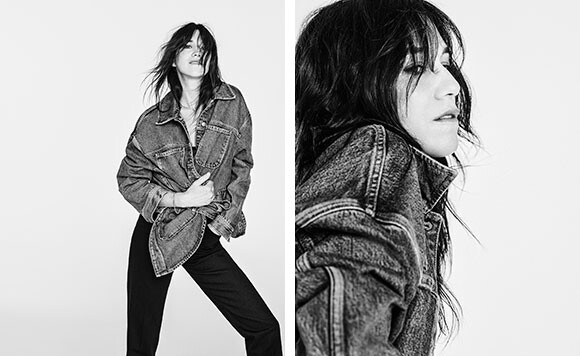 左: シャルロット・ゲンズブールとザラのエクスクルーシブコレクションから。デニムパンツは2種。またアウター3種のひとつは、父親のワードローブからインスパイアされたコーデュロイ素材のオーバーサイズジャケットだ。 右: ジャージー素材のTシャツの下は、スポーティなトライアングルブラ。