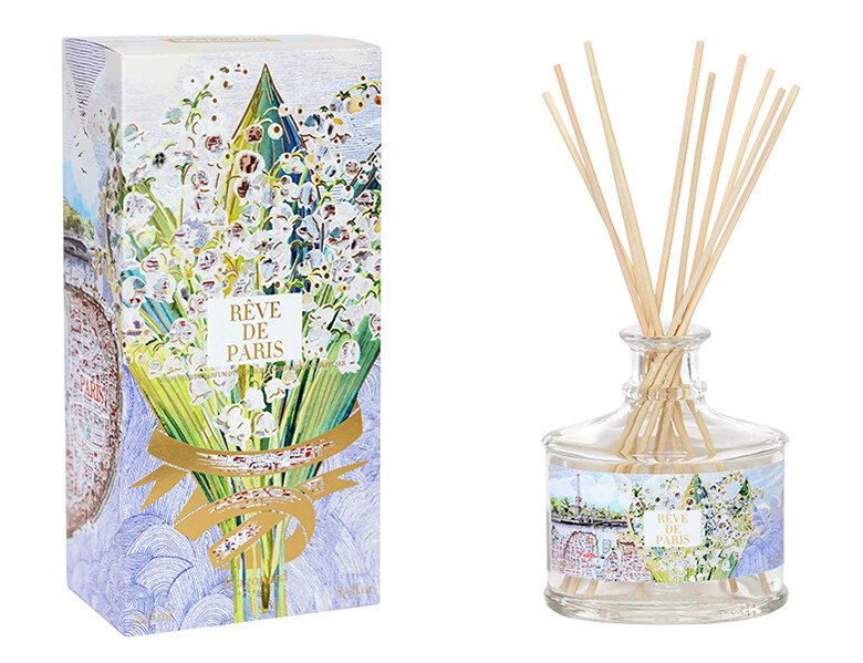 同時に発売されたパリの香りのアロマディフューザーは「Rêve de Paris(レーヴ・ドゥ・パリ)」。パリの洗練を象徴するのにこれ以上の花はないというスズランをメインにセリーヌ・エレナが調香した。愛の花のグリーンノートに満たされた室内で甘い時間を!