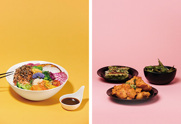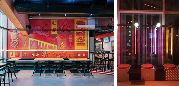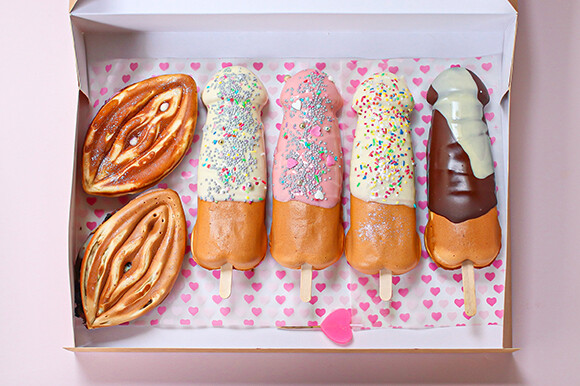 ポップな雰囲気でまとめられたフロアにストリートフードの店を集め、遊園地で食べるような感じのフードコートである。内容はピザの「Magnà(マンニャ)」、シーフードの「Père & Fish(ペール&フィッシュ)」、アジアンバーガーの「Little Baobei(リトル・バオベイ)」、和食の「Kantine(カンティーヌ)」。気を引かれる料理をあちこちで少しずつ、というわがままな食べ方も、フードコートならではだ。テーブル席あるいはカウンターテーブルで気軽に楽しくお腹を満たせる。バーもあるので、ドリンクのために来るのもよし。なお、今年6月までのポップアップのゲストは2区に店を持つ「La Quéquetterie(ラ・ケケットリィ)」だ。ここはちょっと風変わりなスイーツが売り物だ。日本の今川焼きの皮のようにもっちりした食感のパンケーキなのだが、男性器と女性器を象ったフォルムという大胆さ。それぞれコーティングの味を複数から選べる。ちなみにフォルムの人気は紅組より白組!