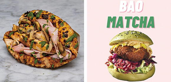 左: マンニャのピザ。丸い1枚を四つ折りしているのが特徴だ。 右: リトル・バオベイの抹茶バーガー。餃子なども販売している。