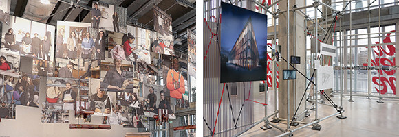 左:「Les Résidents du 19M」。職人たちのポートレート展だ。 右:建物の構想から完成までを写真で見せる。photos:Mariko Omura