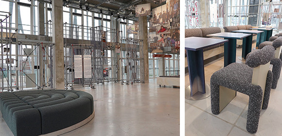 左:半円にまとめられた家具を広げるとコンファレンス会場となる。すでに「サヴォワールフェールとアヴァンギャルド」というテーマで初回が開催されたそうだ。 右:家具のデザインはスタジオCGSVに任された。彼らはシャネルの倉庫にあったブティックの古い家具や装飾物をアップサイクリング。またシャネルの未使用の素材を集めた「Atelier de matières(アトリエ・ドゥ・マティエール)」が1年前に組織され、布はそこのストックからの再利用だ。photos:Mariko Omura