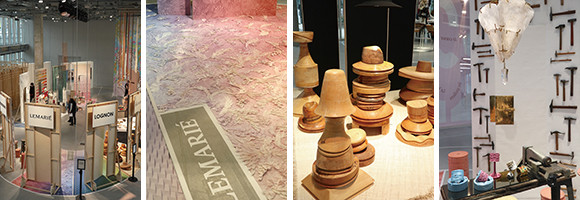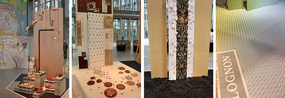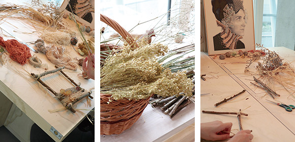 写真は植物の織物のアトリエ。材料はすべて用意され、担当者が8名のテーブルを周遊して指導する。要予約で1名15ユーロ。自分で作った作品は持ち帰れる。なお右の写真の後方は自分のポートレートに刺繍をするという別のアトリエの模範作品だ。photos:Mariko Omura
