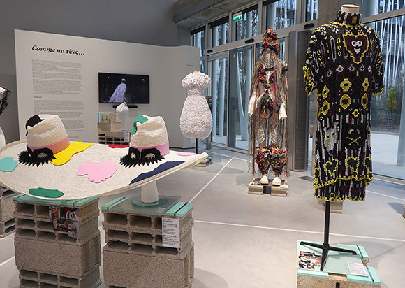 会場内、モード学校の生徒と思しき男女が熱心に一点ずつ見て回るのは、南仏のイエールで毎年開催される若手クリエイターの登竜門といわれる国際モードフェスティバルとle19Mのコラボレーションの展示である。ファイナリストに選ばれた10名が表現したいことを実現する手段として、シャネル傘下のメティエダールと行ったコラボレーションだ。le19Mのレジダント・メゾンに限らず、ジュエリーボタンの「Desrue」や革細工の「Ateliers de Verneuil en Halatte」などの仕事にもここで触れることができる。このコラボレーションは若いクリエイターの要求に応えることで、職人たちにとっては新たなチャレンジとなり、メティエダールを未来へとプッシュする機会となるのだ。わかりやすい例をひとつ。メゾン・ミッシェルとのコラボレーションを選んだファイナリストによるクリエイションは、ふたりで一緒にかぶる帽子。頭部が2つという帽子は過去においてメゾン・ミッシェルが手がけたことのないアイデアだったという。​​