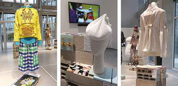 左: Wataru Tominagaは刺繍をルサージュとコラボレーション。 中: Roisin Pierceは帽子をメゾン・ミッシェルとコラボレーション。 右: Emma Bruschiは古い布をアップサイクリングしたブラウスをパロマとコラボレーション。photos:Mariko Omura