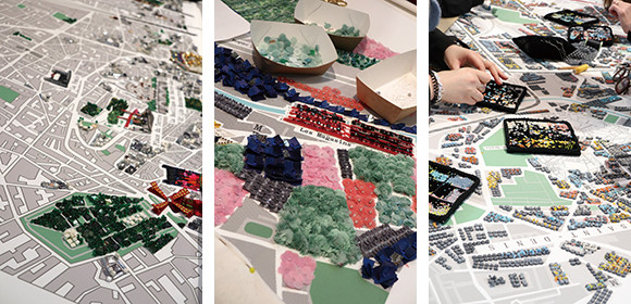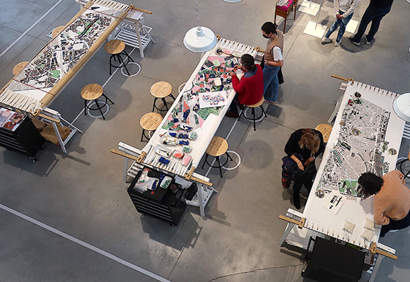 テーブル上の広げられた地図に刺繍をする。席があいていれば、年齢制限がないので誰でも予約なしで参加が可能。開催は毎週水曜と土曜の14時〜17時。