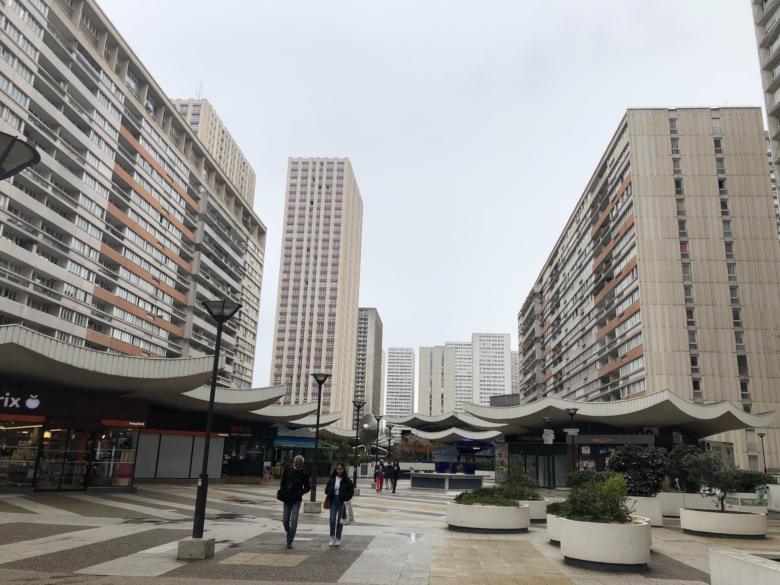 メトロ14番線の駅オランピアードで下車し、通りからエスカレーターを上がると、こんな景色が目の前に現れ、時空を超えてどこか別の場所に降り立ったかのような錯覚に襲われる。ビルに囲まれた広場に商店や飲食店が並ぶ小さな街の名は、オランピアード、映画の原題でもある。主人公のひとり、エミリーが住むアパルトマンは、このビルのどこかの20階。1969年から77年にかけて、当時の都市計画のセオリーに則って作られた「街の中の街」は、札幌、ヘルシンキ、メキシコなど、オリンピック開催都市の名を持つ10棟以上のビルからなる。