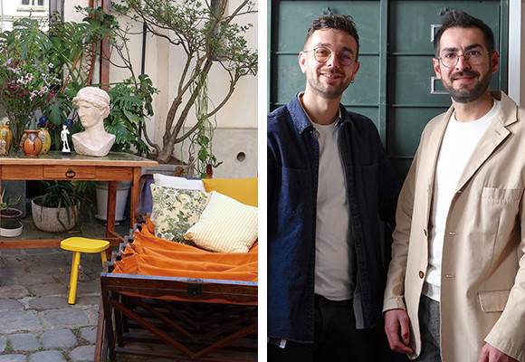 4年前からヴィンテージをめぐる幅広い活動をしている彼らは、デコレーターもすればセノグラフィーも担当するという。店の奥にはアトリエスペースがあり、掘り出した古い品々をここで販売用に手入れするだけでなく、ヴィンテージのオブジェに自分たちのアートセンスを活用。それらをセカンドハンド(セコハン)ならぬ、“サードハンド”と彼らは呼んでいる。そのダチョウの卵のシリーズは店内でもきっとすぐに目に付くだろう。デッドストックの布を用いて作ったアップサイクリング・クッションも販売し、また、古いランプにお隣さんのアントワネット・ポワソンのランプシェードを組み合わせたり、というコラボレーションもあってニュー・リサイクルをふたりが楽しんでいる様子が微笑ましい。