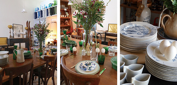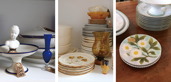 ヴィンテージ・インテリアのオンラインショップとしてパリジェンヌたちに愛されている「Slency」のセレクションも彼らに任されているという。ふたりの審美眼と掘り出し品のクオリティはお墨付き、と言っていいだろう。レストランのシェフから希望のうつわの収集を依頼されることもあれば、またテーブルセッティングのオーダーもあるそうだ。たとえば、先日はパリ市内のある美術館でたった10名のプライベート・バースデーディナーを担当……というように。彼らによるテーブルセッティングでは、お皿が最初から最後まで同じシリーズというフランスのクラシックなテーブルと違って、不揃いなのが魅力である。蚤の市などで古いお皿を買おうとすると、揃いのスープチューリンやソースレードルもセットで合計100ピース!といったことがあるけれど、それはいまの時代にもふたりのセンスにもそぐわない。彼らのブティックでは、お皿も4枚や5枚といった半端な枚数のものも扱う。蚤の市は週末だけだけれど、AXSはウィークデーに掘り出しものが楽しめる素敵なアドレスである。