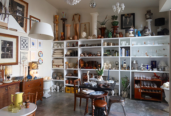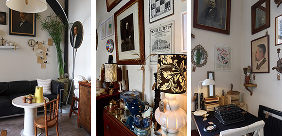 ブティック内、自宅のコーナーのように商品が配置されているのでコーナー丸ごと欲しくなる。中央の写真内の2つのランプはアントワネット・ポワソンのシェードだ。彼らが扱う時代のメインは1930〜90年代で、フランス国内で主に掘り出している。photos:Mariko Omura