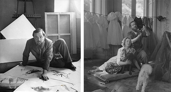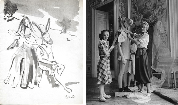 左: プログラムのカバーのためのベラールによるデッサン。 右: タイタニアが恋をするロバ役の衣装を準備中のイラ・ベリーヌ。作曲家ストラヴィンスキーの姪である。©️ Victor Grandpierre