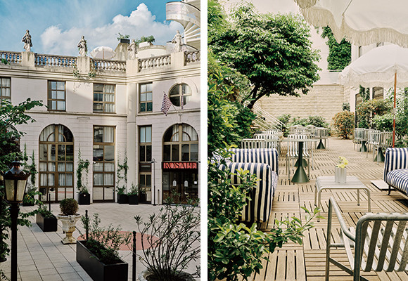 左: 通りに面した鉄の門扉からホテルの入口へ。建物の上に並ぶクラシックな彫像に驚かされる。 右: この建物の地下に広がるレストランのガーデンテラス。photos:Christopher Coenon