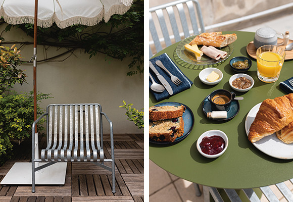 レストランの緑あふれるテラス席。朝食は18ユーロ。アラカルトでもオーダーできる。photos:Carole Cheung