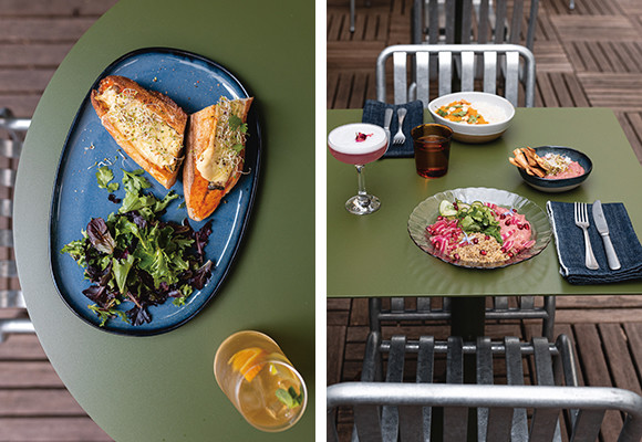 左: メニューにある謎のシャクシュク・バゲット(15ユーロ)の正体がコレ。バゲットにズッキーニやナスなどの温野菜、オムレツそして溶かしたチェダーチーズというサンドイッチだ。 右: ランチ、スナック。時間と曜日で複数の利用法が待っている。ヒヨコ豆のフムスとピタチップスは癖になるおいしさ! パンや焼き菓子は人気の「Meunier(ムニエ)」から。photos:Carole Cheung
