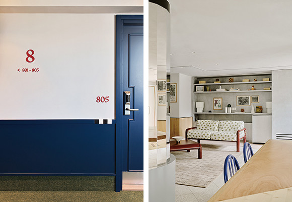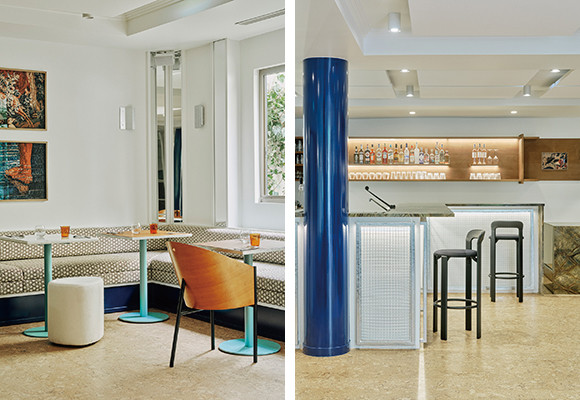 左: 90年代の航空会社の制服にインスパイアされたブルー。 右: レセプションフロア。クローバーのモチーフがチャーミングなソファで寛いで! photos:Hervé Goluza (右)、Christophe Coenon