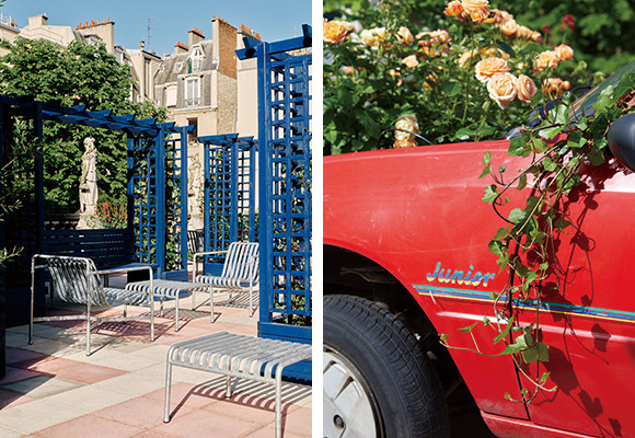 この庭、レストランを宿泊者が自由に楽しめるのはもちろんだが、4階のシークレットガーデンという宿泊者だけが利用できるルーフトップもホテルは隠している。クラシックな彫像に囲まれたシークレットガーデンには、なぜか赤いプジョーが1台。立ち往生し、草花にすっかり覆われたといった風情で……オテル・ロザリーの主役は自然なのだ。