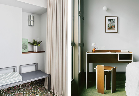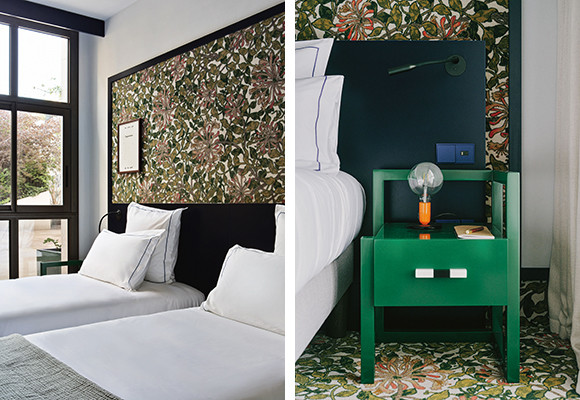 ホテルの内装を担当したのはマリオン・メランダー。パリでは過去にアメリー・ピシャールのバスティーユのブティックを手がけている。このホテルでは庭と室内の境を曖昧にする、というアイデアでインテリアを作り上げた。自然を取り入れる、というのはオーナーであるジョリス・ブルネールの希望だったという。また、大理石のようなノーブルな素材をチープなイメージの素材とミックスし、家具もいくつかは彼女がデザインして、と、パリ市内のホテルとしてはなかなかユニークな客室だ。また1階のロビーホールに置かれたガエ・アウレンティのソファと肘掛け椅子は、彼女がクローバーのモチーフを描き、フランスのファブリックメゾンThevenonに特注した布でカバー。ホテルに入った瞬間に目に入るこのファブリックは、優しく目を和ませ、快適な滞在が待っているという期待を抱かせる。