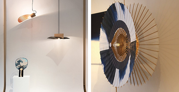 左:Formelは団扇の塩見団扇(左上)、京唐紙の丸二(右上)のそれぞれと平面を立体にする仕事をした。 右:エルザ・ポシャは和傘の内側の美しさを照明に。photos:(左)Matthieu Gauchet(右)Mariko Omura