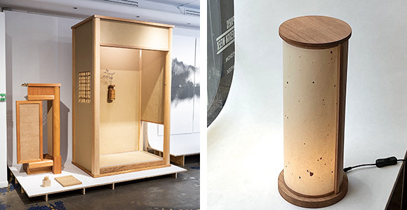 左:Garnier & Linkerとヤマショウの床の間。 右:Garnier & Linkerと京都桐箱工芸によるランプの素材はもちろん桐だ。和紙は植物染めで、写真は柿渋。photos:(左)Matthieu Gauchet(右)Mariko Omura