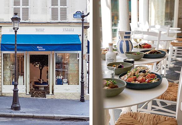 パリ9区のマルティール通りといったら、スイーツ・ストリート。でも、その54番地にこの秋にオープンしたのはパティスリーではなく、オリーブオイルでおなじみの「Kalios(カリオス)」によるイートイン&テイクアウトのレストラン「Maison Kalios(メゾン・カリオス)」だ。エピスリーも兼ねている。斜め向かいにはギリシャ出身で世界的に活躍するアーティスティックディレクターであるヨルゴ・トゥルーパスのカフェ・ヨルガキがあるという立地で、偶然にもギリシャの味がここに2つ揃ったのである。