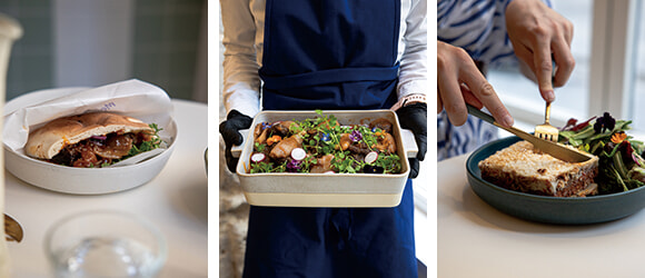 左: ピタパンのサンドイッチ。12ユーロ〜 中: 店の奥のキッチンで季節の素材を用いて作られる料理でメニューが構成されている。 右: ムサカはサラダとセットで16ユーロ。photos:Léo Kharfan