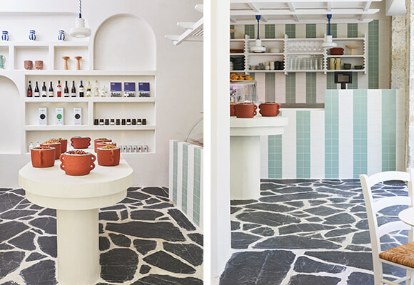 壁の棚がギリシャのおいしい品を集めたエピスリー。Julien Sebbanの建築スタジオUchroniaが室内建築を担当した。photo:Félix Dol Maillot
