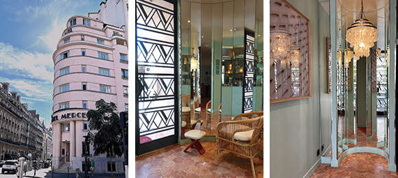 パリにこんなアールデコの建物があったの??と遠くからでもびっくりさせられるのが「Hotel Mercedes Paris(オテル・メルセデス・パリ)」だ。ピンク色の外観はまるでマイアミビーチに並ぶ有名なアール・デコ建築のひとつのよう。1929年の建築物でかつては低所得家庭のための宿だったそうだが、37室とデュプレックス・スイート1室からなる4ツ星ホテルに生まれ変わった。室内建築を任されたのは、ドロテ・ドゥレイユ。内装を手がけるにあたり、彼女はこのマイアミ的外観にインスパイアされたという。