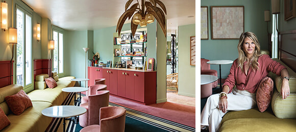 左: オネスティ・バーを備えたロビー・サロン。 右: 室内建築家のドロテ・ドゥレイユ。photos:Hervé Goluza