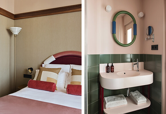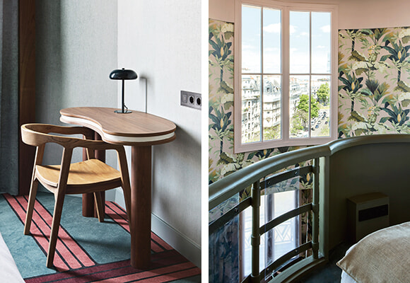 小さなフロントを設置した地上階のロビーフロアは、ピンクとセラドンブルーの組み合わせに70年代のポップなタッチが加えられている。オネスティ・バーがあり、宿泊者はのんびりとここで時間を過ごせるのだ。サロン、そして廊下、階段のカーペットもドロテによるデザインで、グラフィックなモチーフが目を愉しませる。客室内はシンプルな中に明るい色と曲線の遊びが利いていて、心地よい雰囲気。優しいカーブを描く木製のオリジナルデスクがモダンさをプラスしている。建物の7階と8階の2フロアを繋いだデュプレックス・スイートは50㎡という広さ。窓からの眺めと8メートル高さの壁を覆う植物のウォールペーパーが魅力の空間は、いつもとはちょっと違う特別なパリ滞在向けだ。