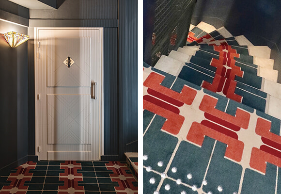20年代後半に流行ったモダンなモチーフにインスパイアされたカーペットがチャーミングだ。photos:Hervé Goluza