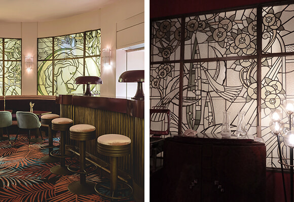 地下の朝食ルームにはさらなる驚きが待っている。アールヌーヴォーの巨匠ジャック・グリュベールが手がけたステンドグラスが保全されているのだ。アールヌーヴォーとアールデコの特徴が交差しているモチーフである。こんなレトロな空間に浸って朝食をとると、ホテルの外に出た時に未来時間にタイムスリップしたような錯覚が起きそう。