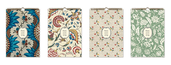 アントワネット・ポワソンの壁紙やテキスタイルでおなじみのモチーフをカレンダーに。左からTorren(トラン)、Jaïpur(ジャイプール)、Baies(ベ)、Indienne(アンディエンヌ)。