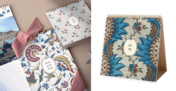 カレンダーのパーソナライズには、12枚の写真をローズムードにメールで送るだけと簡単だ。壁掛けタイプはA4サイズ(29ユーロ~)と大判サイズ(32ユーロ~)、そしてデスク用(27ユーロ~)の3タイプから選べる。アントワネット・ポワソンの18世紀的モチーフの中から選ばれたのは人気のジャイプール、トラン、べ、アンディアンヌの4種。好みの1種を選ぶとカバーにはフルページで、毎月のページにもモチーフの一部がアレンジされている。サプライズで友人や両親にプレゼントするのもいいだろう。
