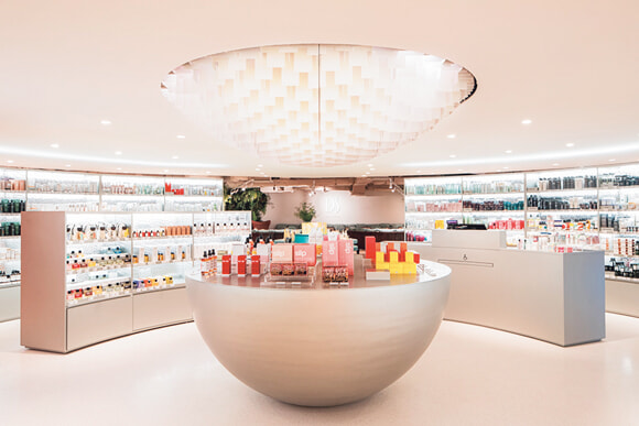 ホリスティックなスキンケアから美容機器、サプリも並ぶ円形の売り場が中央に。photography: Thibaut Voisin