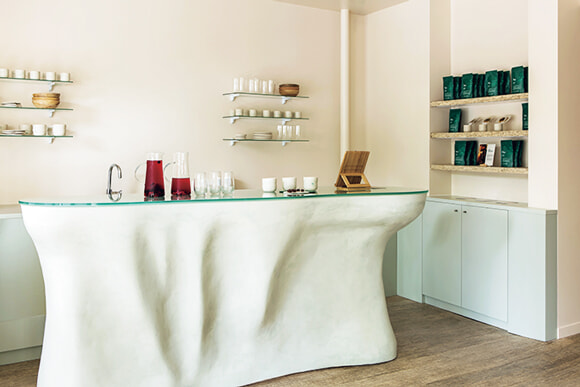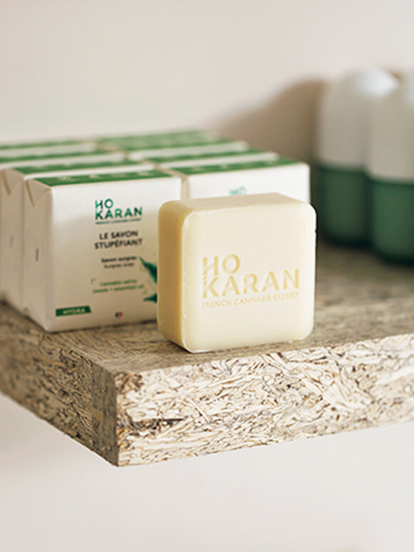 麻の繊維を活用したオリジナル素材を床や棚に使用。カンナビス・サティバ・オイルを主成分とする石けん125g 15ユーロなど。photography: Hervé Goluza