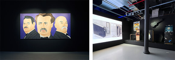 左: 初公開されるアレックス・カッツによるルイ、ジョルジュ、ガストン=ルイの創業家三代の肖像画(2021年)。 右: ミスター・カートゥーンによるポートレート「Lost Angel in Paris」(2021)も初公開。その下には指揮者レオポルド・ストコフスキーの特注デスク、右はダミアン・ハーストの「Secrétaire médical」(2009年)。photos:(左)Adiern Dirand, courtesy of Louis Vuitton、(右)Mariko Omura