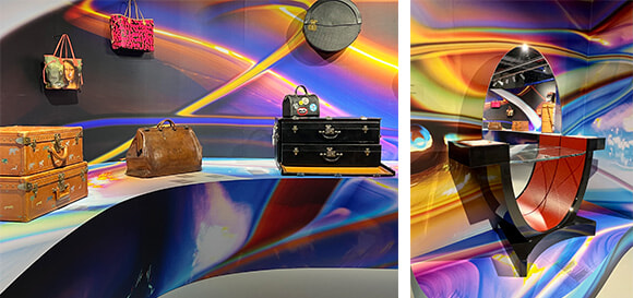 メゾンのメインピースやアーティストたちとのコラボレーションを集めた部屋「Origins」。トランクやカバンが移動手段の変遷に沿って展示されている。中にはウェス・アンダーソン監督の映画『ダージリン急行』のためにオーダーされたトランク(写真左の左)も。会場内、小林健太によるサイケデリックな写真で包まれている 。photos:Mariko Omura