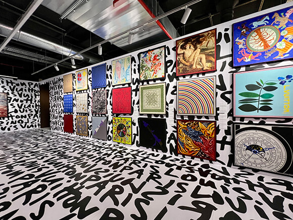 「Art on Silk」はスカーフの部屋。ソル・ルウィット、ジェフ・クーンズ、アンドレ・プットマンなどこれほど大勢のコラボレーションがあったのかと、驚かされる。photo:Mariko Omura