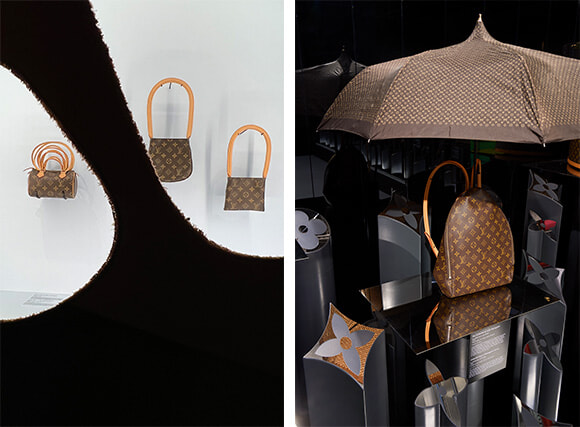 左: コム デ ギャルソンのアーティスティック・ディレクター川久保玲との2回のコラボレーションを展示。 右: モノグラム誕生100周年を記念して、1996年に大勢のクリエイターたちがモノグラムのバッグなどを再解釈した。傘とリュックはシビラによるものだ。photos:(左)Mariko Omura、(右)Adiern Dirand, courtesy of Louis Vuitton