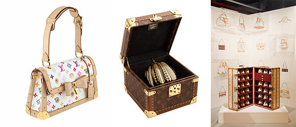 左: 村上隆とのコラボレーション「Eye Need You Bag in Monogram」(2003年)。 中: モノグラムのミノディエールの中は草間彌生の「Gold Pumpkin」。 右: トランク「Marilyn」。photo:(右)Adiern Dirand, courtesy of Louis Vuitton
