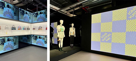 「Leathergoods of Fashion」ではアーティストたちとプレタポルテのアーティスティック・ディレクターとのコラボレーションで、懐かしさがあふれる村上隆とのコラボレーションによるモノグラムバッグに始まり、草間彌生、マスターズコレクション……。締めくくりは、ダニエル・ビュラン、Nigo、グレース・コディントン、クリストファー・ネメスたちとのコラボレーションモチーフが壁にデジタルに描かれる部屋だ。モチーフが来場者たちの動きに反応するという相互作用が楽しい。