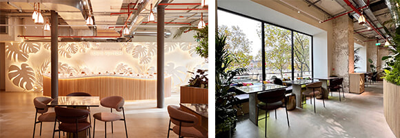 左: 2階のカフェ「Maxime Frédéric at Louis Vuitton」。 右: セーヌ河に面した大きなガラス窓から、ポン・ヌフや左岸を眺める。photos:(左)Adiern Dirand, courtesy of Louis Vuitton、(右)Mariko Omura