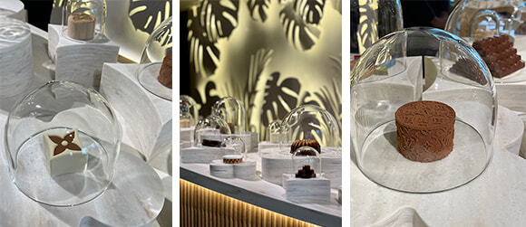 展覧会の後はマキシム・フレデリックのカフェとチョコレートショップ、そしてギフトショップが待つ2階へと。このフロアは予約不要である。シュヴァル・ブランのシェフパティシエとして2022年度のゴ・エ・ミヨ賞パティシエ部門を受賞した彼が、ルイ・ヴィトンのモノグラムやコードを生かしたビジュアルの中に、おいしさと食感のおもしろさを凝縮したパティスリーをクリエイト。セーヌ河とサマリテーヌに面してガラス窓が開くトロピカルな雰囲気のカフェで、これらを味わう幸せな時間を。
