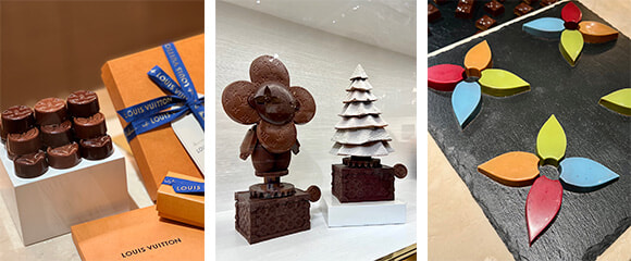 チョコレートショップはルイ・ヴィトンのトランクに囲まれた中央に、オーク材の美しいカウンターが。モノグラムのチョコレートや、ダミエのタブレット、全身チョコレートのヴィヴィエンヌ……。クリスマスツリー型のチョコレートは”脇の出っ張りを回すと回転するんだよ!”と、プレス発表に際してマキシム・フレデリックはうれしそうに実演をしてみせた。パッケージも素敵だし、タブレット1枚でも素敵なお土産になること、間違いなしだ。なお周囲に並べられたトランク。実はこの中のいくつかはチョコレート用冷蔵庫!