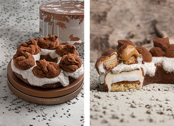 今年のノエルのパティスリーももちろん! テーマは雪で、味はキャラメルとココナッツの2種あり、それがパウンドケーキやタブレットなど7種での展開だ。メインはなんといっても、雪の中にうずくまる6匹のキツネのパティスリー。その愛らしい姿は食べずに眺めていたいほどだけど……ミルクチョコレート、ココナッツ、キャラメルが軽やかにまた濃厚に、と異なるテクスチャーで口を満たし、煎ったフルーツがカリカリとした食感で幸福感に拍車をかける。