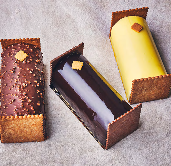 もちろんブティックでは従来通りのビュッシュ・ドゥ・ノエルも販売している。ビュッシュ・パティシエールはメルヴェイユーズ、モンブラン、そして新作のビュッシュ・ネロリだ。この新作はマロン、ノワゼット、バニラの味わいがとろけるおいしさで、オレンジの花のフレッシュな香りを染み込ませた円盤型のセラミックがセットされている。味わう環境でもパティスリーの世界観を、という新しい体験をセバスチャンは提案するのだ。また、チョコレート・ロール、マロン・ロール、カフェ・ロールというクラシックな3種のビュッシュも。これらは子ども時代のクリスマスの懐かしい思い出に浸れる味だ。