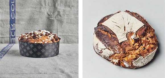 左: パネトーネは18ユーロ。 右: パン・ドゥ・ノエル(12ユーロ)は12月17日〜24日の販売。
