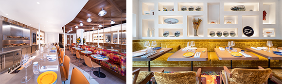左: 1階。左がカウンター席でシーフード・ビストロのように魚介が氷の上に並んでいる。 右: 2階席の奥の部屋。