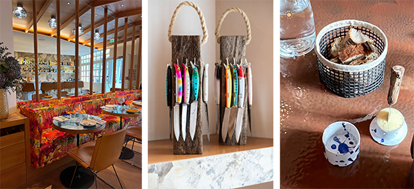 左: 店内に入るや明るい色に迎えられ気が浮き立つヴィーヴ。 中: 着席後、客それぞれがナイフをセレクトする。 左: MOFのフレデリック・ラロスのパン。これだけ食べてもおいしく、また料理のソースを1滴も残さず食べるお供に最高だ。パン籠はブルターニュの牡蠣養殖所の籠をヴィクトワール・フォンテーヌがリサイクルしたもの。photos:Mariko Omura