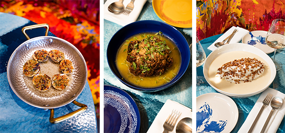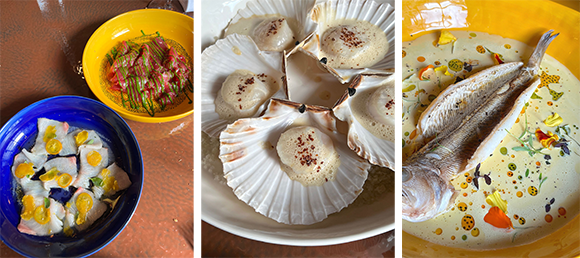 左: メニューの「生」から、カンパチ(手前/26ユーロ)とマグロ(28ユーロ)。魚それぞれの味を引き出すソースや香りづけが素晴らしい。 中: 温かい料理からホタテ貝(38ユーロ)。 右: 温かい料理から「Vive à la flamme」はスパイスと花でカラフルなソースが食卓に華やぎを演出。photo:Mariko Omura